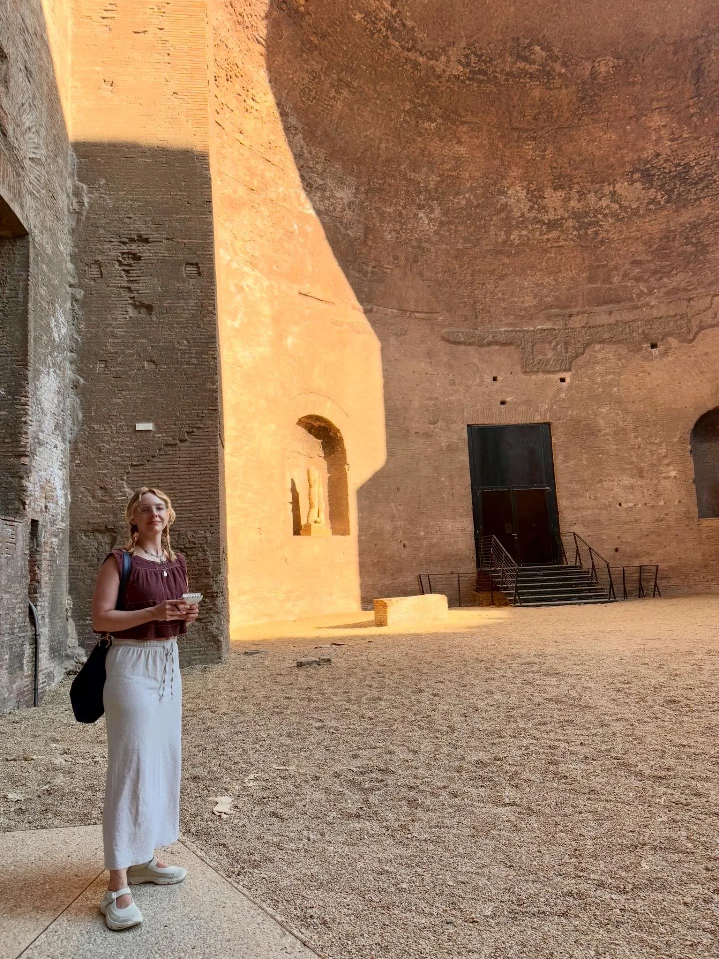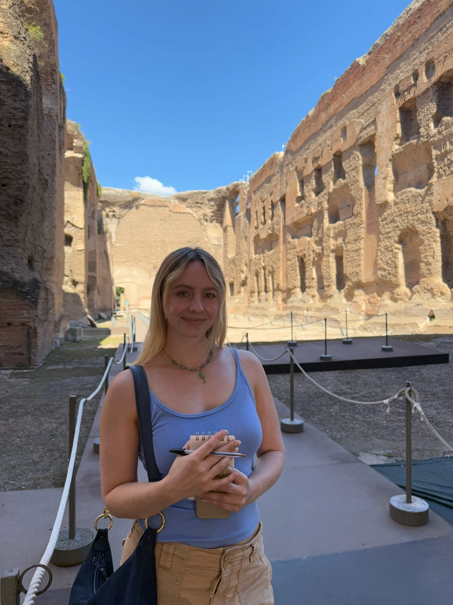 The residency begins in Rome, where I’ll conduct on-site research at major bathhouse complexes including the Baths of Diocletian and the Baths of Caracalla, while attending guided archaeological tours across the city. I’ve secured access to the library at the British School at Rome, an internationally renowned institute supporting contemporary artists and scholars. There, I’ll engage with excavation records and texts in Roman archaeology to support my field research. Through sketches, visual journaling, and meditative channeling, I’ll begin gathering source material for a new body of work.